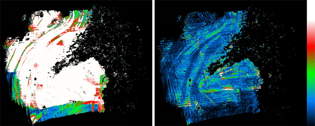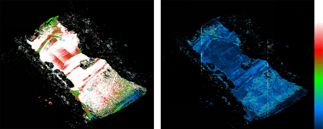 上記画像の左は解析前のデータ、右は解析後のデータ。右側のカラーマップはZ値で、下の黒が0cmで上の白まで50cm