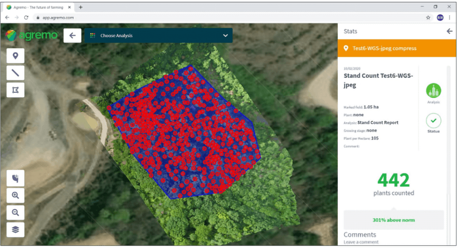 Metashape等で作成したオルソ画像を指定のクラウドにアップすることで、自動処理され、解析結果(エリア面積、樹木の本数)を取得できます。詳細は、弊社まで(info@opt-techno.com)お問い合わせください。