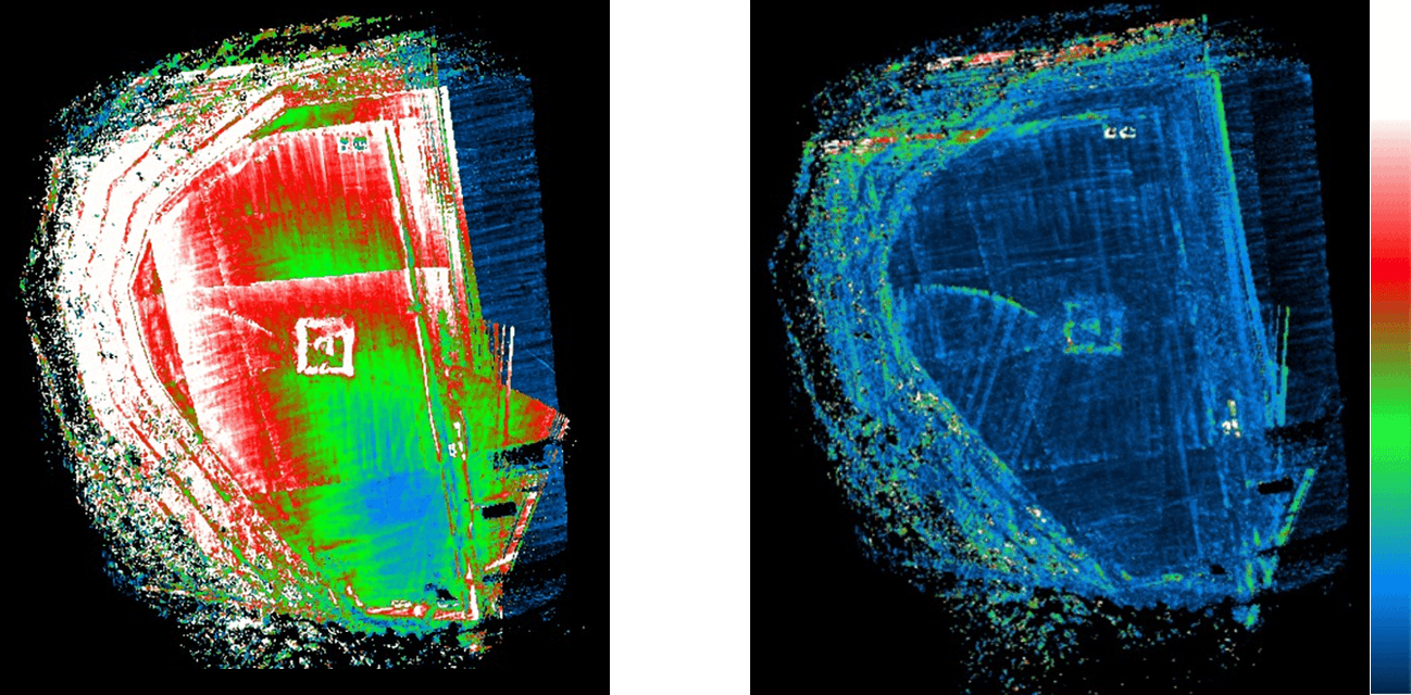 左は、白色の50cm以上の誤差が発生している。右は、大多数の領域が誤差10cm程度の水色に収まる。