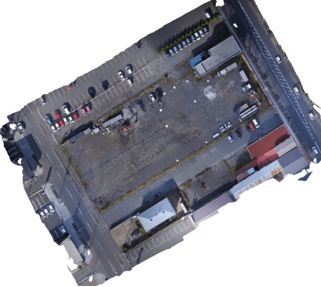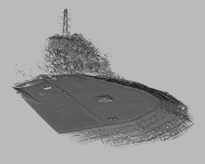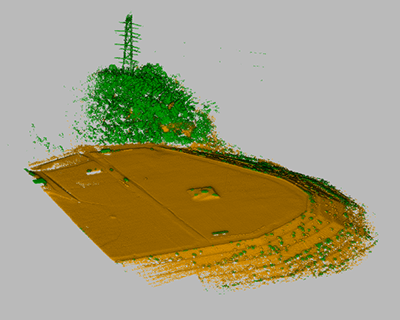 ドローンレーザーは地形の起伏も分かるため、短時間で正確に土量を測ることができ、地形の変位量の観測にも利用可能です。ドローンと同時に撮影したカメラ画像からオルソ画像を作成し、点群データに貼り付けることができます。カラー点群は工事現場を鮮明に可視化できます。以下で示す例は、ドローンレーザー RN50を使用し、フライトラインの自動合成はStripAlignソフトウェアで処理し(合成時間約15分)、および、点群データ処理ソフトウェアはOPT Cloud Surveyを使用しました。精度検証の結果、誤差は3.4cm以下となりました。