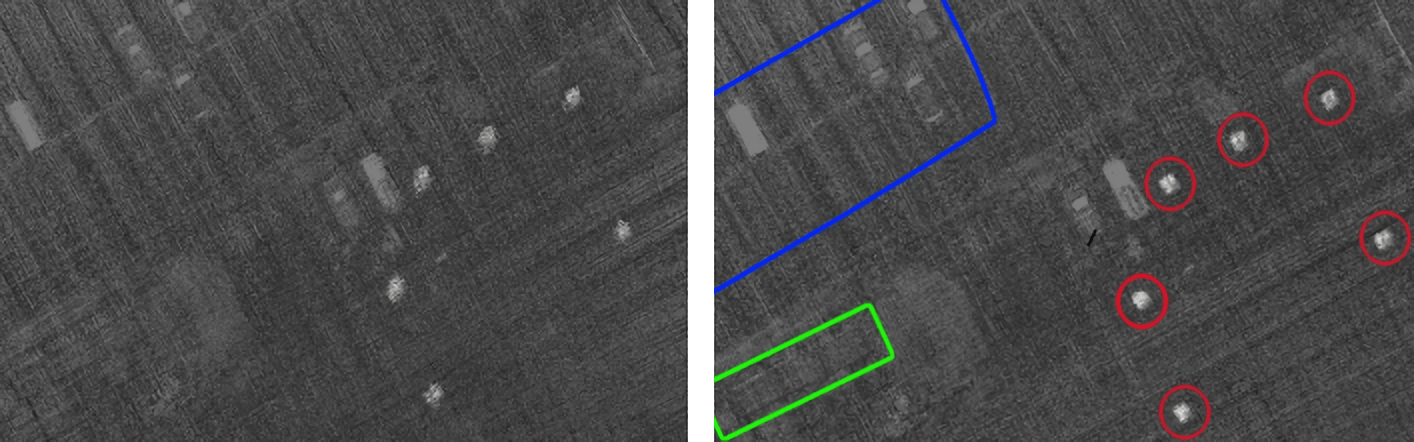 ドローンに搭載したカメラで撮影した画像から、指定エリア内にある樹木を数えることができます。