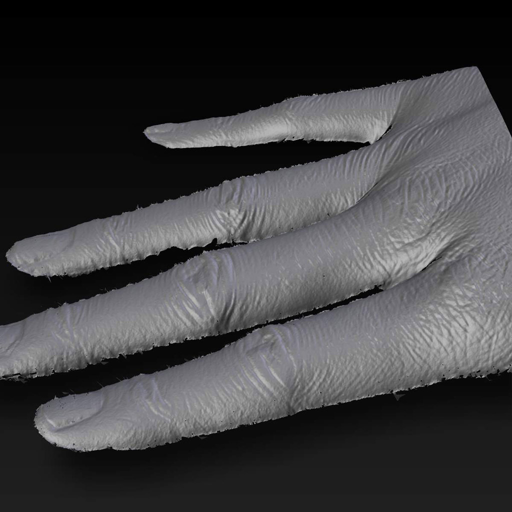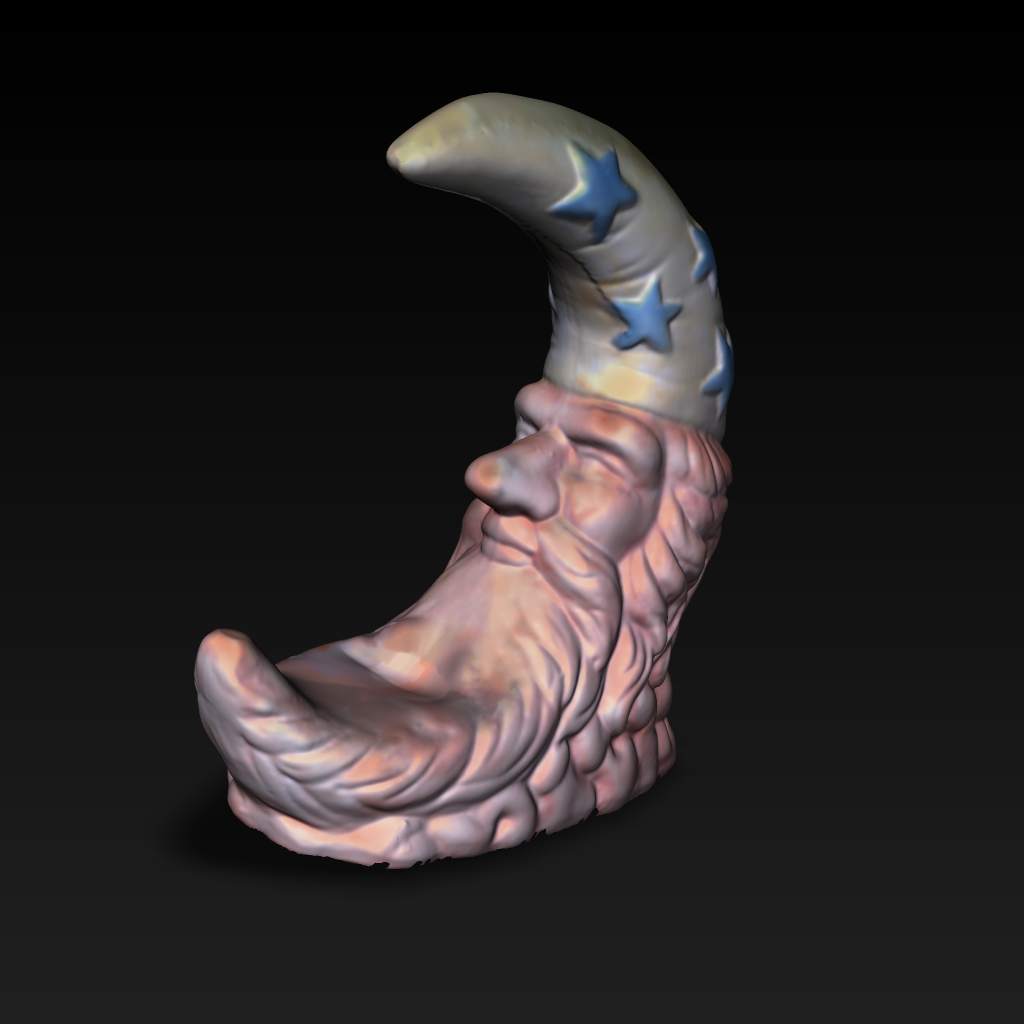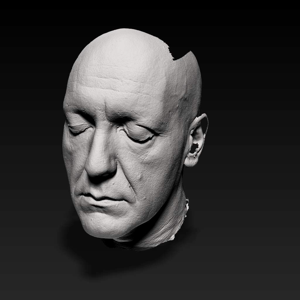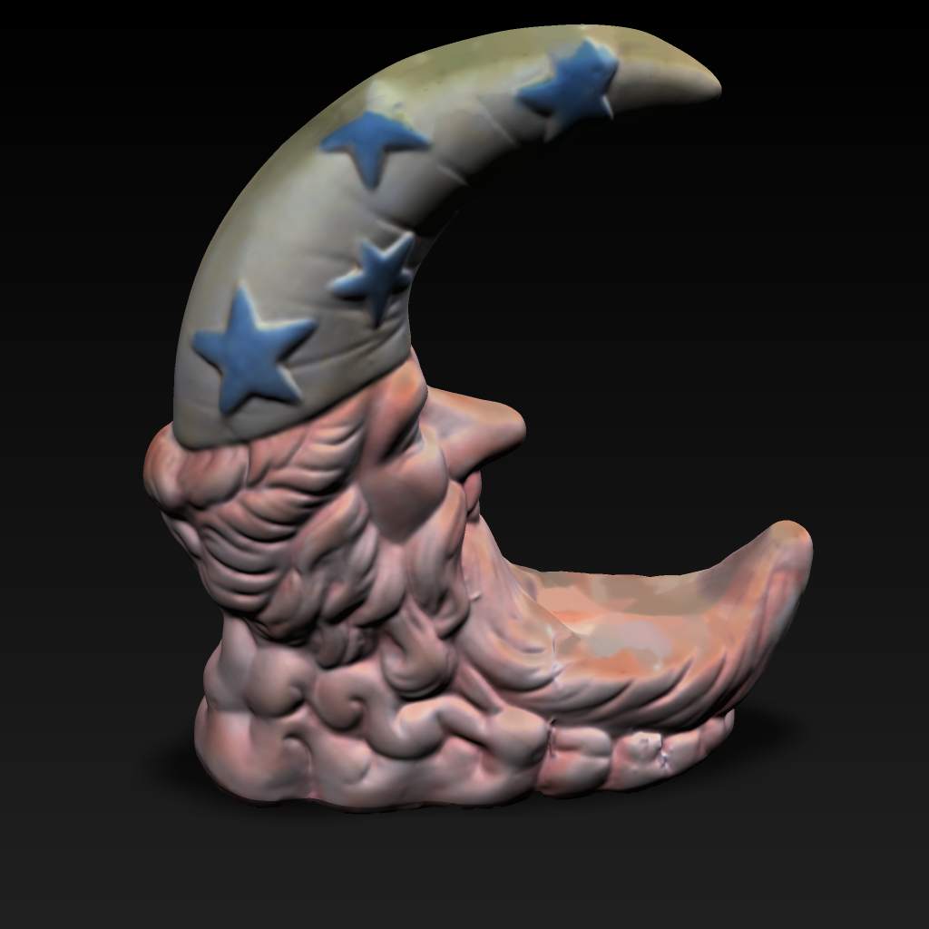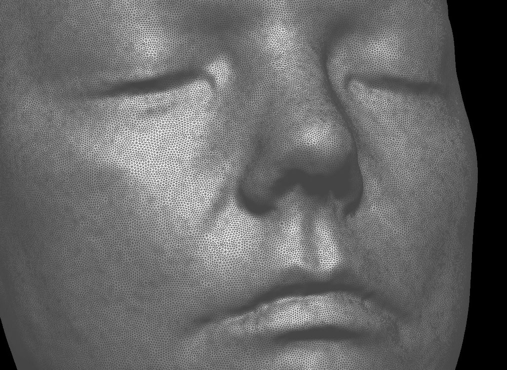 Nikon D50カメラと解像度 800x600のプロジェクターを使い計測しています。RapidForm 2006を使いメッシュを作成しました。画像の貼り付けは、FlexScan3Dの中のautomatic UV Projectionを使用しています。